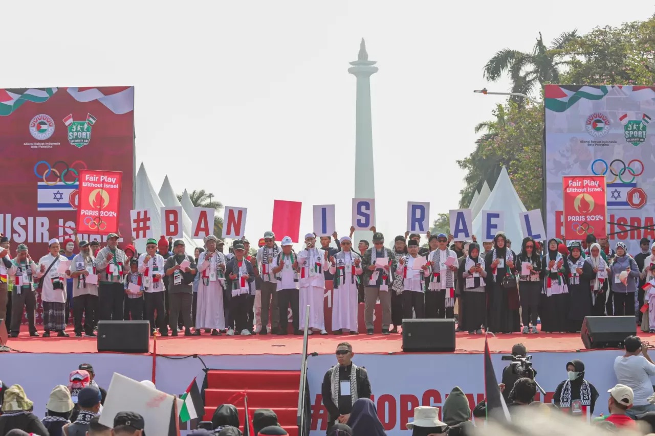 Di atas panggung, di depan ratusan masyarakat yang hadir dengan atribut syal dan bendera Palestina mereka secara bergantian membaca pernyataan sikap yang pada intinya menolak dan mendesak Komite Olimpiade Dunia untuk menolak Kontingen Israel ikut serta pada Olimpiade Dunia di Paris pada 26 Juli-11 Agustus 2024.