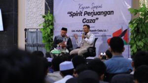 “Kita hari ini ada dalam dua pilihan, apakah kita menjadi diam badai Al-Aqsha menjadi lewat begitu saja di hadapan rumah kita tanpa ikut berjuang di dalamnya atau kita menjadi bagian dari barisan badai angin perjuangan kemerdekaan Al-Aqsha,” tegasnya.