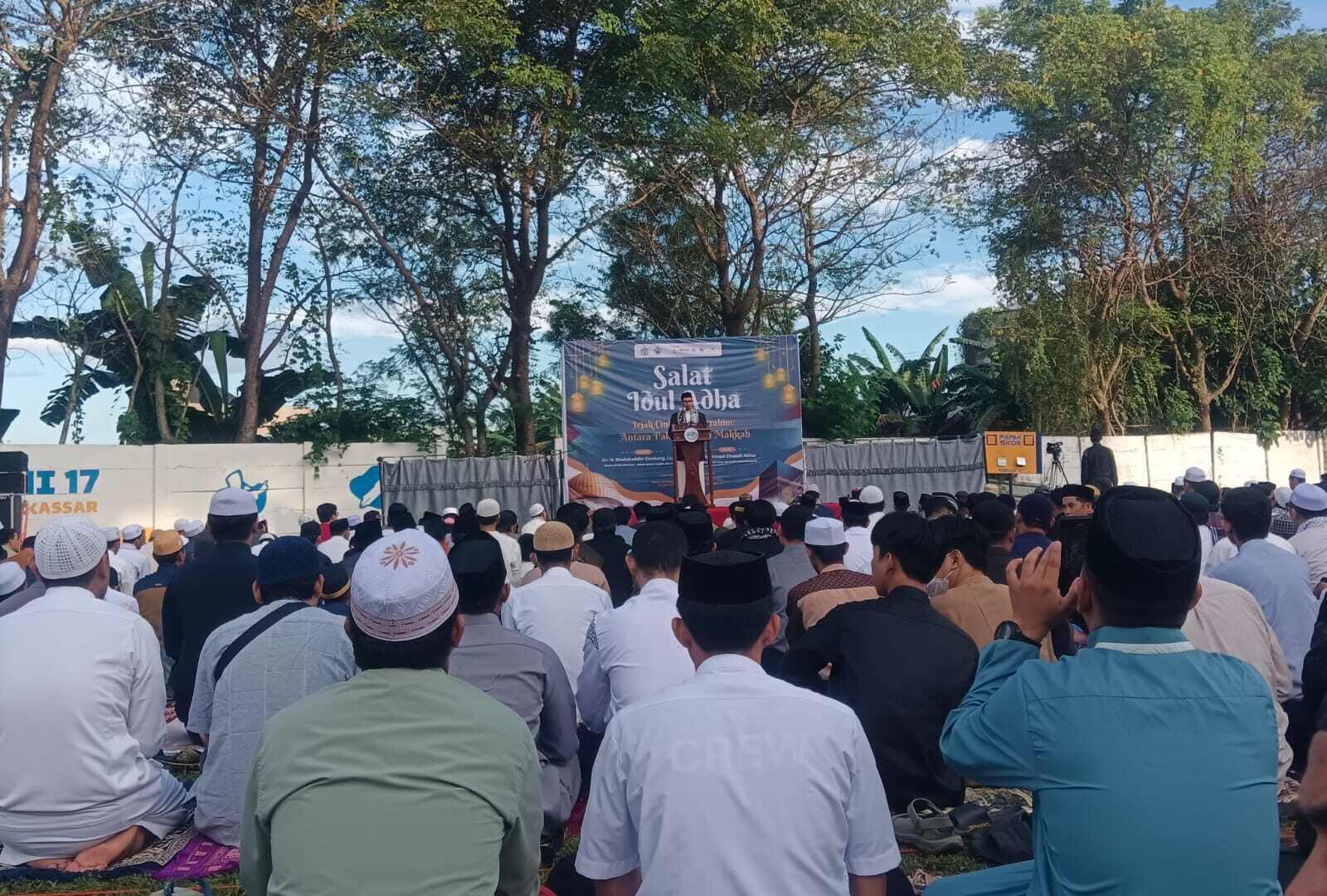 MAKASSAR — Takbir menggema sahut-menyahut memenuhi ruang dan waktu seantero Nusantara. Ribuan jamaah memadati lapangan Uhud Sekolah Tinggi Ilmu Islam dan Bahasa Arab (STIBA) Makassar dalam pelaksanaan salat Iduladha 1445 H, Senin (17/06/2024).