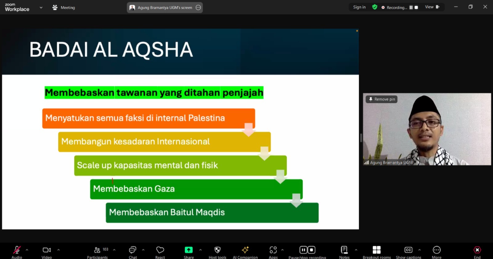 Kegiatan Edukasi kepalestinaan ini adalah pertemuan kesebelas yang rutin dilaksanakan setiap pekannya, pada pertemuan ini materi disampaikan oleh Ustaz Ir. Muhammad Agung Bramantya, S.T., MT., M.Eng., Ph.D., IPM., ASEAN Eng., dihadiri 100 lebih peserta dari berbagai wilayah di Indonesia hingga luar negeri.