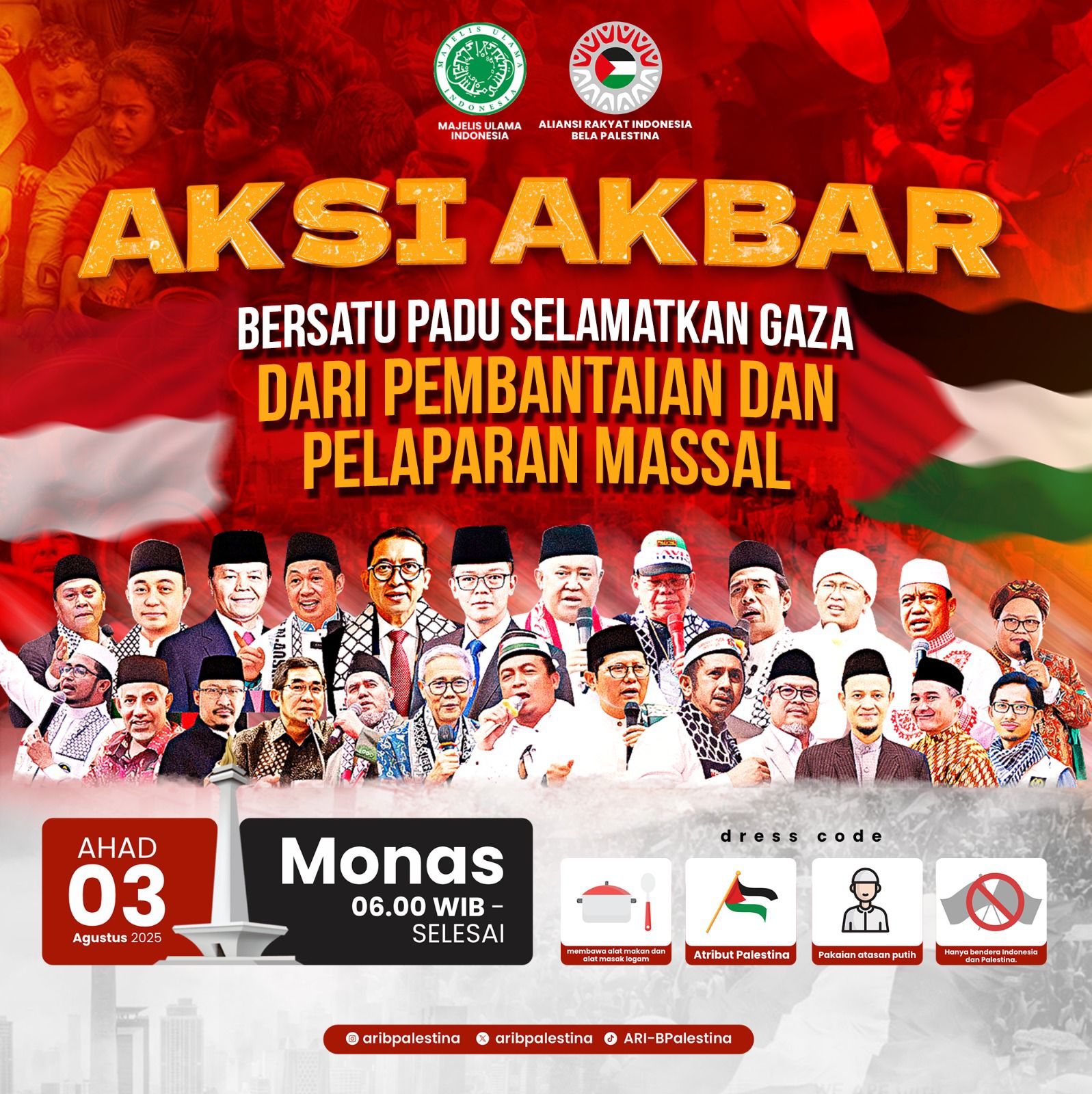 Rangkaian aksi itu akan berlanjut pada Ahad, 3 Agustus 2025 di Monumen Nasional (Monas), Jakarta, dalam bentuk mobilisasi rakyat secara damai sebagai bentuk solidaritas global terhadap Gaza.